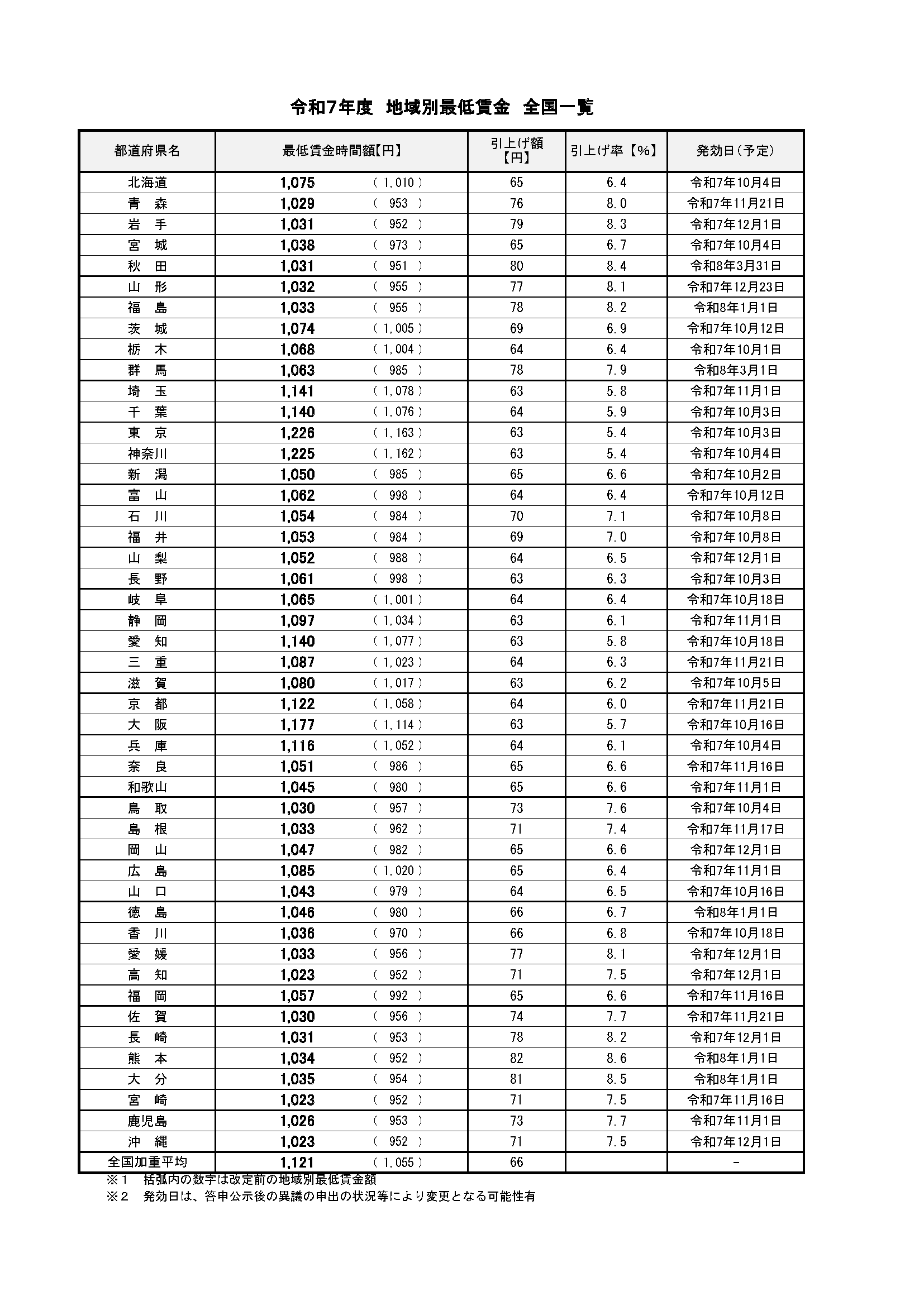2025年度 全国都道府県別最低賃金一欄表(厚生労働省資料より抜粋)